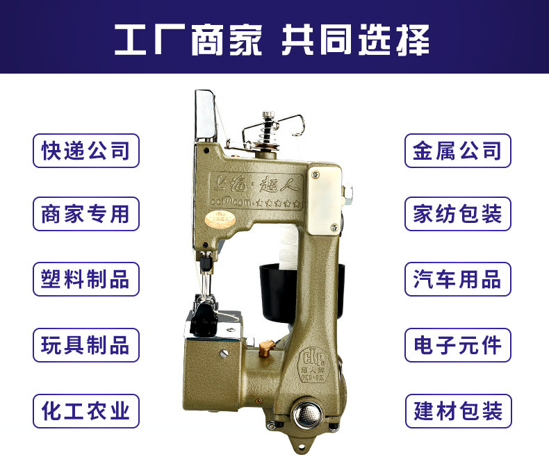 较大的工厂和仓库,适用于粮,糖,盐食品,化肥,化工产品等物品的帆布袋,麻袋,面粉袋,编织袋,纸袋的封包工作。