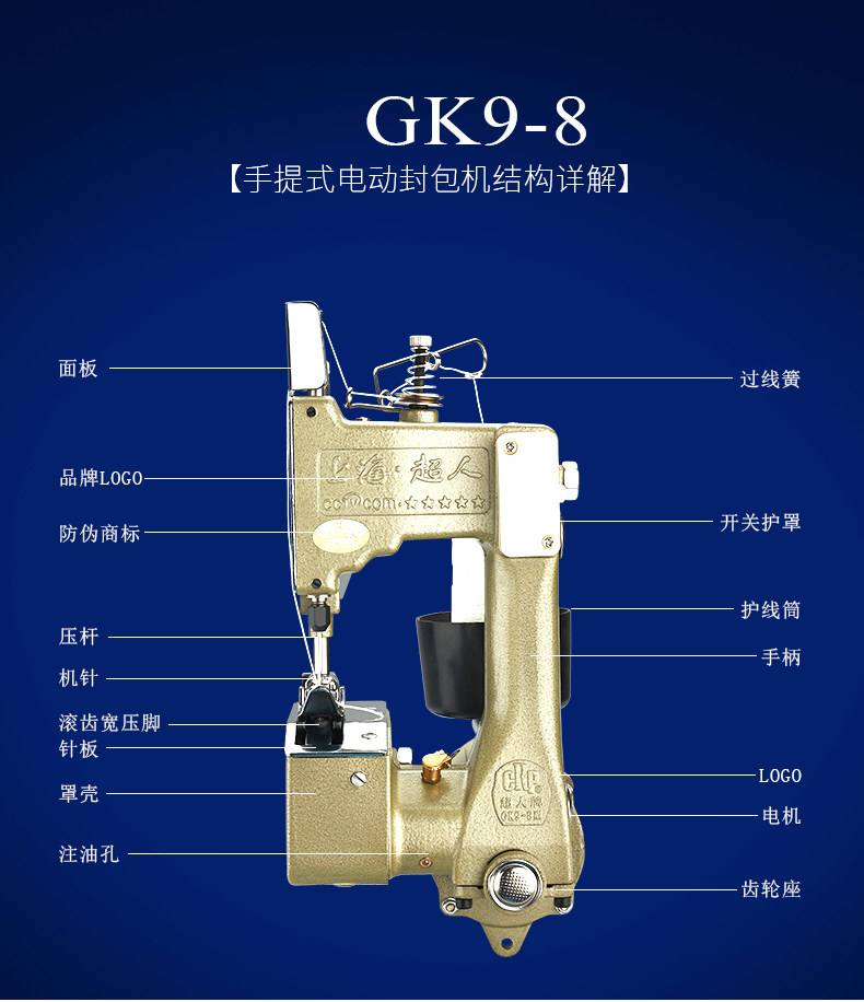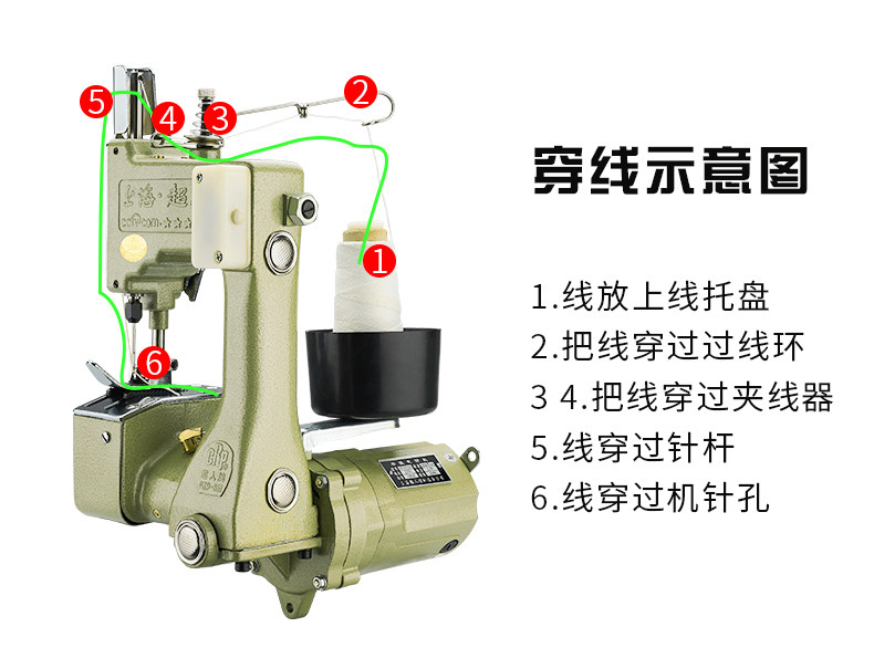 缝包机操作方法:缝包机操作方法簡單,只要將線穿好,提起機器對準要縫製袋子,按動開關即可進行縫包工作。
